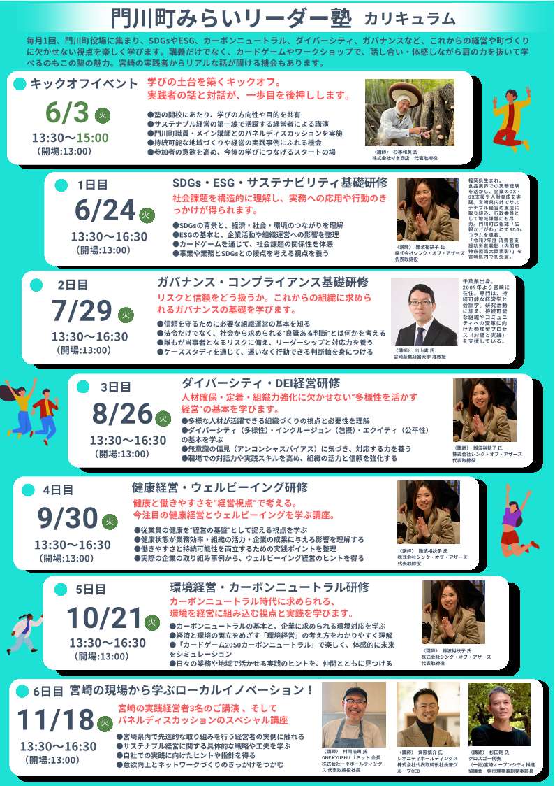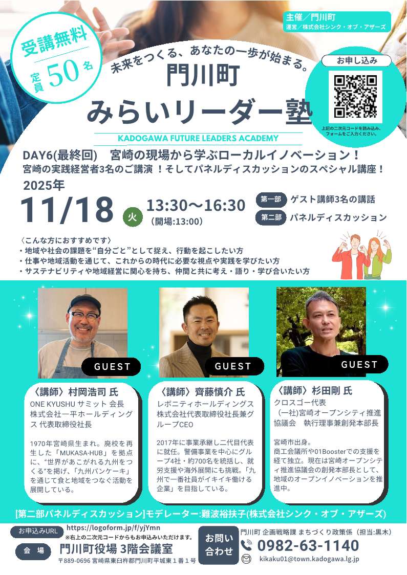 今回が、6月から月1回開催してきたみらいリーダー塾の最終回です。最終回は宮崎県で活躍する3名の経営者をお招きし、パネルディスカッションを行います。