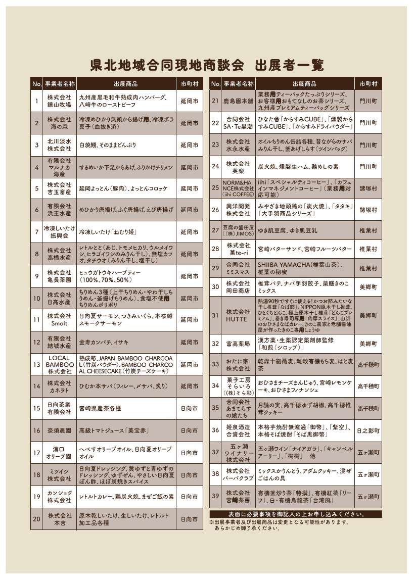宮崎県北に位置する9市町村(延岡市・日向市・門川町・諸塚村・椎葉村・美郷町・高千穂町・日之影町・五ヶ瀬町)の生産者・食品加工業者39社が一堂に会し、豊かな自然に恵まれた一次産品から、こだわりの加工食品まで地域色豊かな商品をご紹介します。