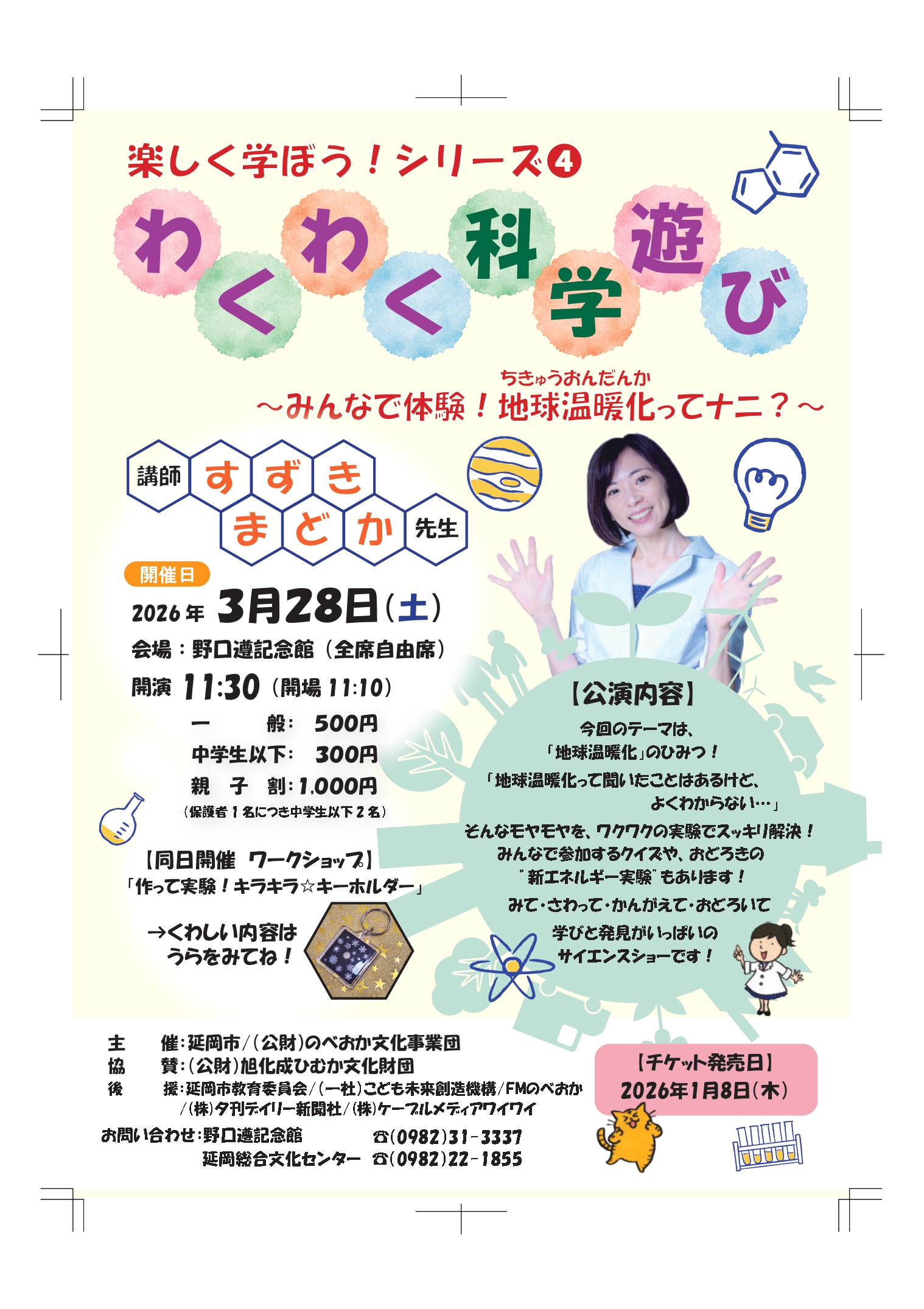 今回のテーマは「地球温暖化」。「地球温暖化って聞いたことはあるけど、よく分からない…」そんなモヤモヤを、わくわくの実験ですっきり解決!みんなで参加するクイズや、おどろきの“新エネルギー実験”もあります。
