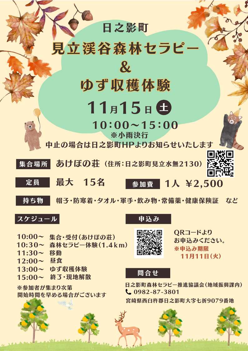 日之影町にて、「森林セラピーとゆず収穫体験」が開催されます。