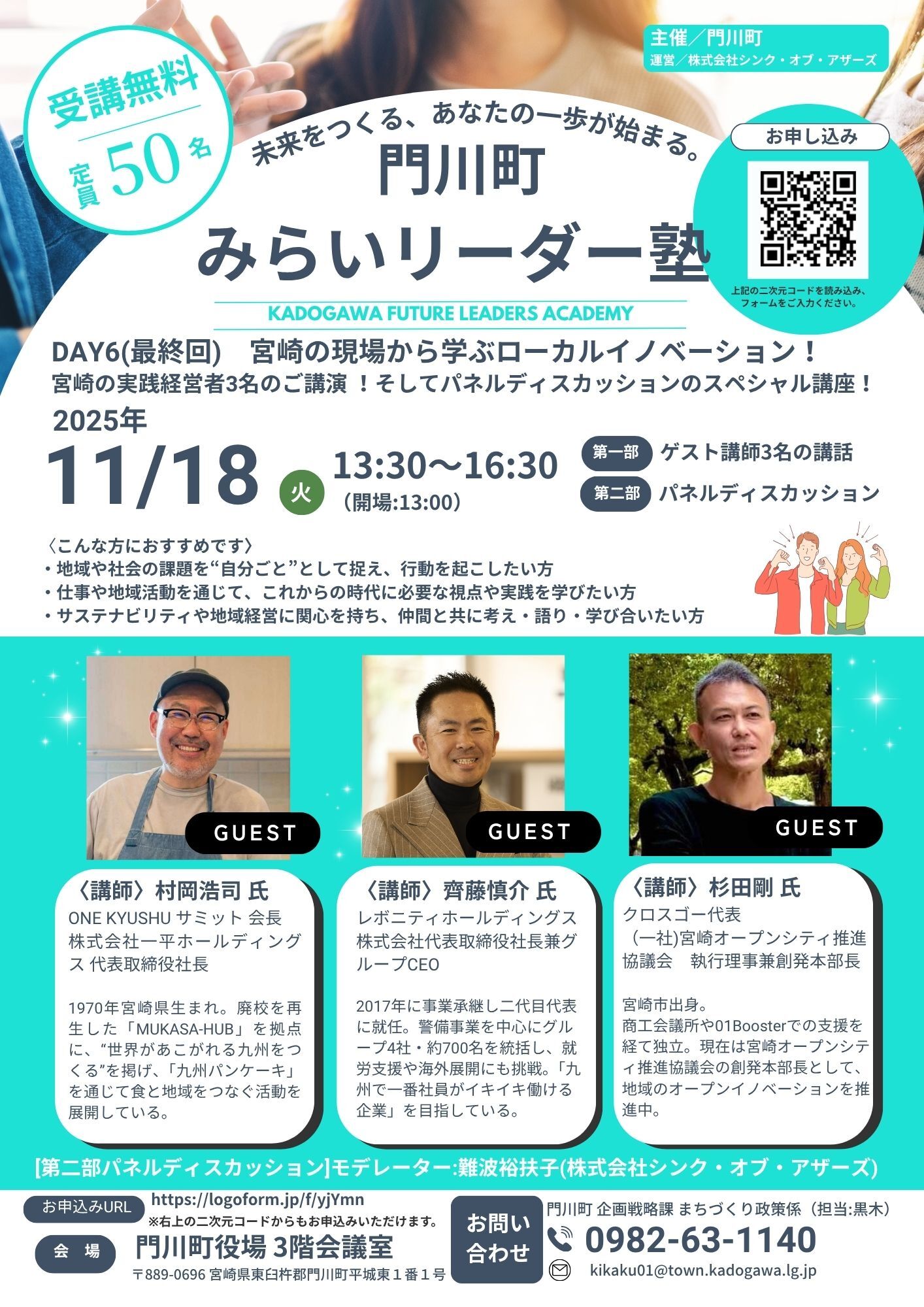 今回が、6月から月1回開催してきたみらいリーダー塾の最終回です。最終回は宮崎県で活躍する3名の経営者をお招きし、パネルディスカッションを行います。